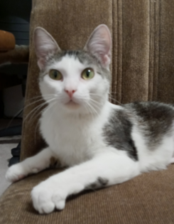 Winnie has a very friendly, inquisitive, and playful temperament and is quick to purr. She enjoys exploring, playing, and being petted. When she is finished playing, she will curl up on a favorite lap for some one-on-one time. When you walk into the room where she is, she will get up and walk or run toward you to greet you. She hopes you are bringing her a snack (she loves mealtimes), probably due to her past of not having food on a regular basis. She enjoys interacting with and being around her foster mom and dad, and frequently follows them around the house to be where they are.