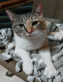 Patches was immediately comfortable with human kindness and living indoors. When Patches was taken to the vet to receive thorough examination(s) and testing(s), the veterinarian determined that she was already spayed. Unfortunately, without a microchip, no other information was obtainable, such as what vet clinic provided care to her, what her name was, where she used to live, or contact information for her guardian/owner. Patches is FIV/FeLV negative, microchipped (now), and current on vaccinations and flea prevention.